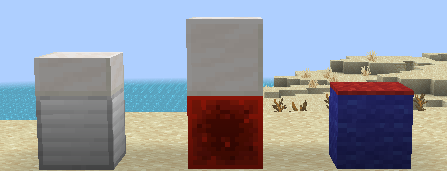 <table data-view="cards"><thead><tr><th align="center"></th></tr></thead><tbody><tr><td align="center">위: 빨간색 양탄자<br>아래: 파란색 양털</td></tr><tr><td align="center">위: 석영 블록<br>아래: 레드스톤 블록</td></tr><tr><td align="center">위: 석영 반 블록<br>아래: 철 블록</td></tr></tbody></table>